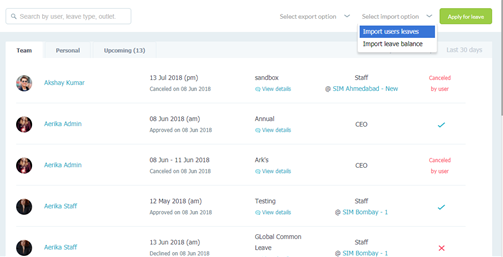Aside from these, you can also find the big, green Apply for leave button as well as options to import and export your data. You can export/import your data by user's leaves or leave balance.