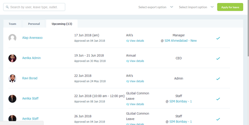 Once you select Leaves from the main menu to the left of your view in the web app, you will be greeted by the main Leaves section. Here, you’ll notice a few options. The section is divided into three parts, Team, Personal and Upcoming. There is also a search bar where you can search by user, leave type or outlet.